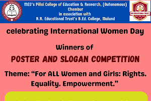 To celebrate International Women’s Day, Pillai College of Education and Research, Chembur, along with R. R. Educational Trust’s B.Ed. College, Mulund, organized an online Poster and Slogan Writing Competition. The aim of this competition was to spread awareness on the theme “For All Women and Girls: Rights, Equality, and Empowerment.” B.Ed. students from various colleges...Read More