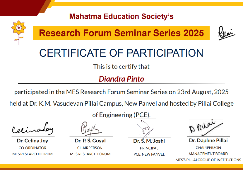 Received a certificate of appreciation for participation in state level 2nd Research Scholars Meet on 1st August, 2014 at Chembur Sarvankash Shikshanshastra Mahavidyalaya.