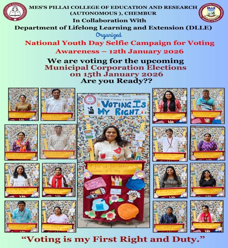 MES’s Pillai College of Education and Research (Autonomous), Chembur, in collaboration with the Department of Lifelong Learning and Extension (DLLE), organized a National Youth Day Selfie Campaign for Voting Awareness on 12th January 2026.