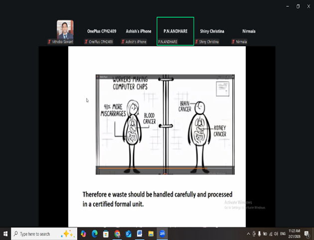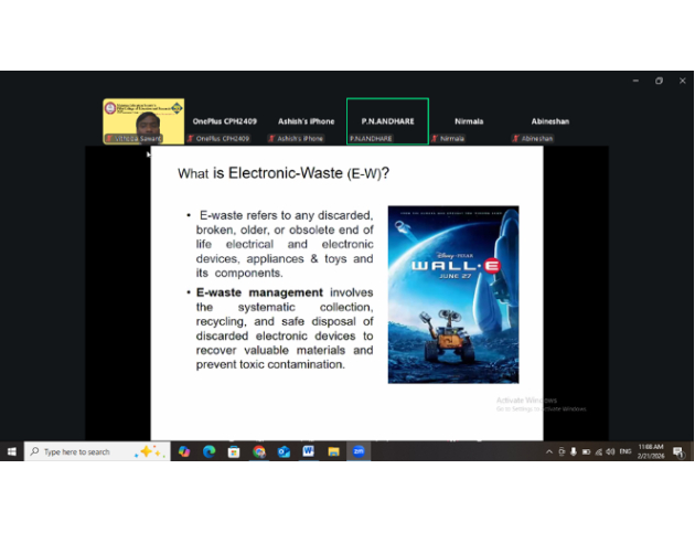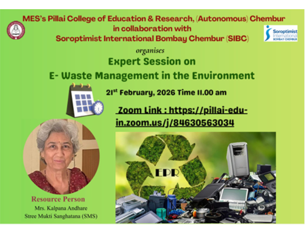 MES Pillai College of Education and Research (PCER), Autonomous, Chembur, in association with Soroptimist International Bombay Chembur (SIBC) and Stree Mukti Sanghatana, organized an online expert session on “E-Waste Management in the Environment” on 21st February 2026 with Ms. Kalpana Andhare from Stree Mukti Sanghatana as the resource person. The session aimed to promote environmental education and awareness among students, encourage responsible waste management practices for sustainable urban living, highlight the importance of reducing, reusing, and recycling electronic waste, and raise awareness about environmental protection and sustainable practices to reduce ecological impact. During the session, Ms. Andhare explained the growing problem of electronic waste resulting from rapid technological advancement and consumerism, noting that India is the third largest producer of e-waste, which poses serious environmental and health hazards if not managed properly. She elaborated on the harmful effects of improper disposal of electronic devices on soil, water, and human health. The session also highlighted the importance of public awareness, responsible consumption, and collective efforts in managing e-waste effectively. B.Ed. and BBA students attended the session and gained valuable insights into sustainable practices such as repairing, reusing, and recycling electronic devices. The session was highly informative and successfully created awareness among students about the importance of proper e-waste management, aligning with the Sustainable Development Goals like SDG 11 – Sustainable Cities and Communities, SDG 12 – Responsible Consumption and Production, and SDG 13 – Climate Action.