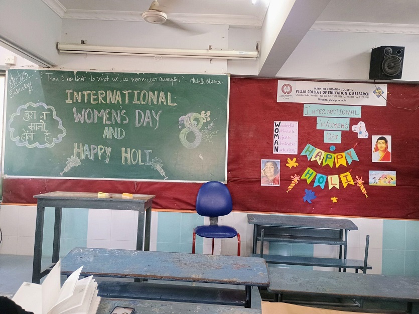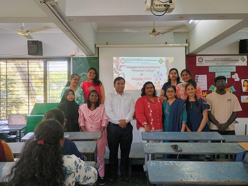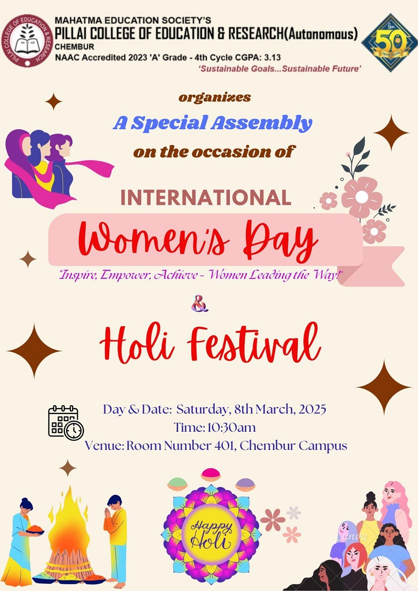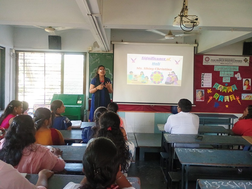 A special assembly was held at Pillai College of Education and Research, Chembur, to celebrate International Women’s Day and Holi. The event, organized for B.Ed. students, was a mix of inspiration and celebration, focusing on the achievements of women and the importance of Holi. Students gave speeches on famous women, highlighting those who have made a big difference in education, science, sports, politics, and social work. These speeches reminded everyone about the progress made toward equality and the need to keep supporting and empowering women. Overall, the assembly was a meaningful and enjoyable experience, inspiring students and helping them appreciate both women’s empowerment and the joy of Holi.