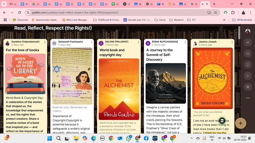 MES’s Pillai College of Education and Research, Chembur, celebrated World Book and Copyright Day on 23rd April 2025, with an engaging Padlet activity titled “Read, Reflect, Respect (the Rights!)”. B.Ed and BBA students participated by sharing creative book reviews in the form of text, videos, and posters. Each post reflected on how the chosen book impacted them personally, while also highlighting the importance of copyright in protecting authors’ intellectual rights. The activity fostered a love for reading and awareness of literary ethics, making it a meaningful celebration of both creativity and responsibility.