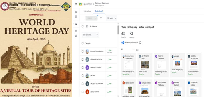 On the occasion of World Heritage Day 2025, MES’s Pillai College of Education and Research, Chembur, organized a Virtual Heritage Tour on 18th April, 2025 for F.Y.B.Ed. students to celebrate global cultural and historical heritage. Students explored various heritage sites from India and around the world using platforms like Google Arts & Culture, UNESCO World Heritage Centre, and AirPano. Each student selected one site and submitted a report including its image, location, origin, significance, and a personal reflection on their experience.